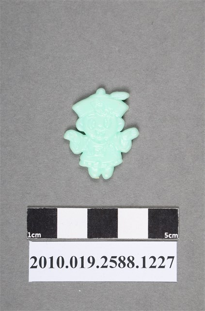 1.本物件為殭屍尪仔仙。硬質塑膠材質,扁平,單一不透明綠色,雙面浮雕圖案,兩面圖案相同。圖案為Q版殭屍,因有橢圓形黑眼圈,為男孩形象。其嘴巴張開,表情呈愉悅貌,頭戴古代官帽,官帽上貼有1張符咒,符咒揚起,身穿古代官服,胸前有補子,身上掛有朝珠,雙手往前舉起,腳尖墊起。2.尪仔仙尺寸大致可分成小、中、大型,小型約長2-5公分,中型約長8-15公分,顏色以單色為主。有些大型的則可長達30公分左右,以菩薩、神仙和民間傳說故事人物等造型為主,塗上金銀紅黃彩漆等亮色。1960、70年代的尪仔仙多以民間傳說故事、歌仔戲、布袋戲人物為造型。1980年代改以卡通、電玩、漫畫人物造型為主。常見玩法之一為兩人(或多人)各持一只尪仔仙,輪流用手指彈射,看誰的尪仔仙先疊在對方上面,便可贏得對方用來對戰或是約定的尪仔仙。
