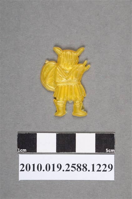 1.本物件為持盾人型尪仔仙。硬質塑膠材質,扁平,單一不透明黃色,雙面浮雕圖案。正面圖案為站立男性,頭上有2支角狀物,肩膀上亦有角狀物,下半身有裙狀服飾,雙手拿著盾牌,膝蓋上有角狀物構件。2.尪仔仙尺寸大致可分成小、中、大型,小型約長2-5公分,中型約長8-15公分,顏色以單色為主。有些大型的則可長達30公分左右,以菩薩、神仙和民間傳說故事人物等造型為主,塗上金銀紅黃彩漆等亮色。1960、70年代的尪仔仙多以民間傳說故事、歌仔戲、布袋戲人物為造型。1980年代改以卡通、電玩、漫畫人物造型為主。常見玩法之一為兩人(或多人)各持一只尪仔仙,輪流用手指彈射,看誰的尪仔仙先疊在對方上面,便可贏得對方用來對戰或是約定的尪仔仙。