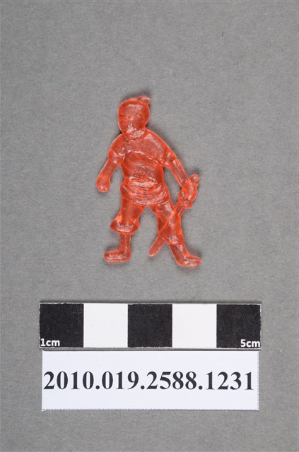 1.本物件為持劍人型尪仔仙。硬質塑膠材質,扁平,單一橘紅色,雙面浮雕圖案。正面圖案為站立人型,為古代人裝扮,頭上綁有髮髻,身穿右衽衣服,雙手袖子捲起,左腳褲管捲起,左腳的鞋子掉了,其右手拿著1把劍,劍頭朝下。2.尪仔仙尺寸大致可分成小、中、大型,小型約長2-5公分,中型約長8-15公分,顏色以單色為主。有些大型的則可長達30公分左右,以菩薩、神仙和民間傳說故事人物等造型為主,塗上金銀紅黃彩漆等亮色。1960、70年代的尪仔仙多以民間傳說故事、歌仔戲、布袋戲人物為造型。1980年代改以卡通、電玩、漫畫人物造型為主。常見玩法之一為兩人(或多人)各持一只尪仔仙,輪流用手指彈射,看誰的尪仔仙先疊在對方上面,便可贏得對方用來對戰或是約定的尪仔仙。