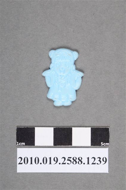 1.本物件為殭屍尪仔仙。硬質塑膠材質,扁平,單一不透明藍色,雙面浮雕圖案,兩面圖案相同。圖案為Q版女性殭屍,因有橢圓形黑眼圈。其頭上綁有2個髮髻,有瀏海,嘴巴張開,其身穿裙子,裙子有摺,胸前戴有1串珠子,雙手平行舉起。2.尪仔仙尺寸大致可分成小、中、大型,小型約長2-5公分,中型約長8-15公分,顏色以單色為主。有些大型的則可長達30公分左右,以菩薩、神仙和民間傳說故事人物等造型為主,塗上金銀紅黃彩漆等亮色。1960、70年代的尪仔仙多以民間傳說故事、歌仔戲、布袋戲人物為造型。1980年代改以卡通、電玩、漫畫人物造型為主。常見玩法之一為兩人(或多人)各持一只尪仔仙,輪流用手指彈射,看誰的尪仔仙先疊在對方上面,便可贏得對方用來對戰或是約定的尪仔仙。