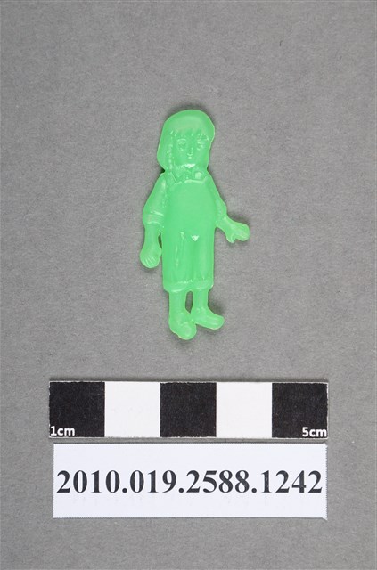 1.本物件為吊帶褲人型尪仔仙。硬質塑膠材質,扁平,單一不透明綠色,雙面浮雕圖案,兩面圖案相同。圖案為穿著吊帶褲的女孩,為站姿,髮型為長度在肩膀左右,有部分頭髮編為辮子,有瀏海。其雙手放在身旁,無特殊動作。2.尪仔仙尺寸大致可分成小、中、大型,小型約長2-5公分,中型約長8-15公分,顏色以單色為主。有些大型的則可長達30公分左右,以菩薩、神仙和民間傳說故事人物等造型為主,塗上金銀紅黃彩漆等亮色。1960、70年代的尪仔仙多以民間傳說故事、歌仔戲、布袋戲人物為造型。1980年代改以卡通、電玩、漫畫人物造型為主。常見玩法之一為兩人(或多人)各持一只尪仔仙,輪流用手指彈射,看誰的尪仔仙先疊在對方上面,便可贏得對方用來對戰或是約定的尪仔仙。