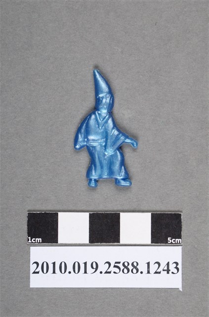 1.本物件為戴帽人型尪仔仙。硬質塑膠材質,扁平,單一不透明藍色,雙面浮雕圖案。正面圖案為站立人型,其戴著尖型高帽子,身穿長袍,袍長及腳,寬袖,中間有腰帶,身體往後彎腰,雙手微微抬起。2.尪仔仙尺寸大致可分成小、中、大型,小型約長2-5公分,中型約長8-15公分,顏色以單色為主。有些大型的則可長達30公分左右,以菩薩、神仙和民間傳說故事人物等造型為主,塗上金銀紅黃彩漆等亮色。1960、70年代的尪仔仙多以民間傳說故事、歌仔戲、布袋戲人物為造型。1980年代改以卡通、電玩、漫畫人物造型為主。常見玩法之一為兩人(或多人)各持一只尪仔仙,輪流用手指彈射,看誰的尪仔仙先疊在對方上面,便可贏得對方用來對戰或是約定的尪仔仙。