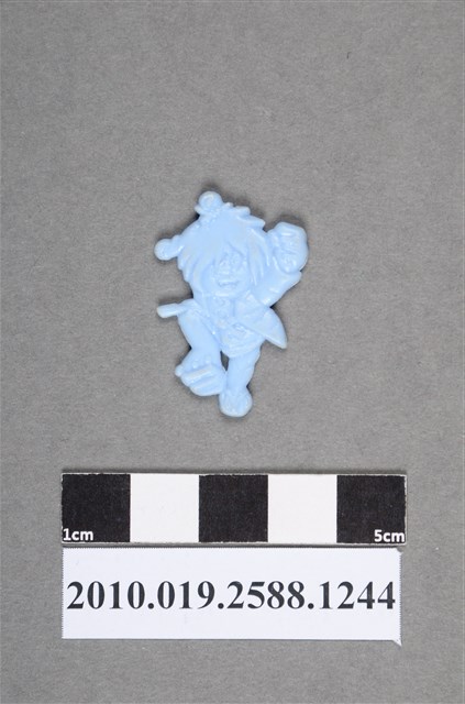 1.本物件為藍色人型尪仔仙。硬質塑膠材質,扁平,單一不透明藍色,雙面浮雕圖案,兩面圖案相同。圖案為頭髮將一眼蓋住的人型,僅露出單眼,嘴巴張開,表情呈高興貌,腳穿著木屐。其一手握拳往前伸,一手往後伸,一腳抬起,一腳著地,為走動的動作。2.尪仔仙尺寸大致可分成小、中、大型,小型約長2-5公分,中型約長8-15公分,顏色以單色為主。有些大型的則可長達30公分左右,以菩薩、神仙和民間傳說故事人物等造型為主,塗上金銀紅黃彩漆等亮色。1960、70年代的尪仔仙多以民間傳說故事、歌仔戲、布袋戲人物為造型。1980年代改以卡通、電玩、漫畫人物造型為主。常見玩法之一為兩人(或多人)各持一只尪仔仙,輪流用手指彈射,看誰的尪仔仙先疊在對方上面,便可贏得對方用來對戰或是約定的尪仔仙。