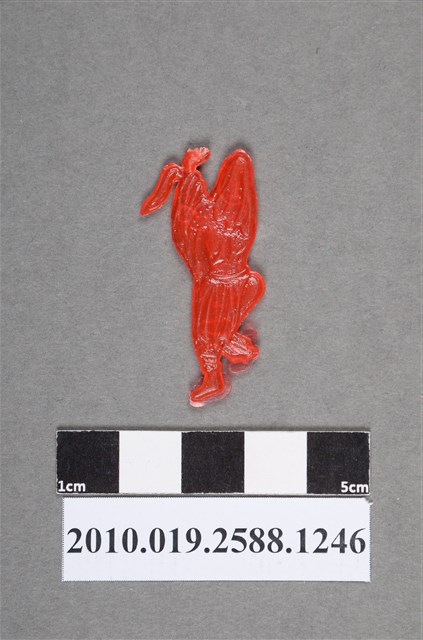1.本物件為橘紅色人型尪仔仙。硬質塑膠材質,扁平,單一橘紅色,雙面浮雕圖案。正面圖案為跳舞的人型,其頭上披垂著頭巾,雙手合起來往左肩舉高,左腳著地,右腳彎起來,膝蓋碰觸另一隻腳。2.尪仔仙尺寸大致可分成小、中、大型,小型約長2-5公分,中型約長8-15公分,顏色以單色為主。有些大型的則可長達30公分左右,以菩薩、神仙和民間傳說故事人物等造型為主,塗上金銀紅黃彩漆等亮色。1960、70年代的尪仔仙多以民間傳說故事、歌仔戲、布袋戲人物為造型。1980年代改以卡通、電玩、漫畫人物造型為主。常見玩法之一為兩人(或多人)各持一只尪仔仙,輪流用手指彈射,看誰的尪仔仙先疊在對方上面,便可贏得對方用來對戰或是約定的尪仔仙。