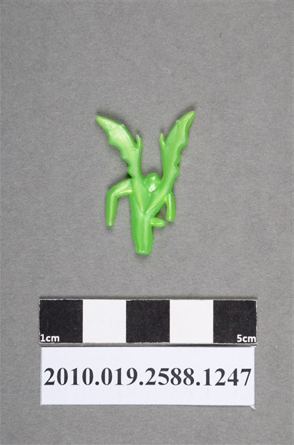 1.本物件為飛天怪物尪仔仙。硬質塑膠材質,扁平,單一不透明綠色,雙面浮雕圖案。正面圖案為翅膀飛起來的怪物,翅膀長在背上,一手彎曲置於腹前,但手肘斷裂,另一手略往外拱起,下半身無腳。2.尪仔仙尺寸大致可分成小、中、大型,小型約長2-5公分,中型約長8-15公分,顏色以單色為主。有些大型的則可長達30公分左右,以菩薩、神仙和民間傳說故事人物等造型為主,塗上金銀紅黃彩漆等亮色。1960、70年代的尪仔仙多以民間傳說故事、歌仔戲、布袋戲人物為造型。1980年代改以卡通、電玩、漫畫人物造型為主。常見玩法之一為兩人(或多人)各持一只尪仔仙,輪流用手指彈射,看誰的尪仔仙先疊在對方上面,便可贏得對方用來對戰或是約定的尪仔仙。