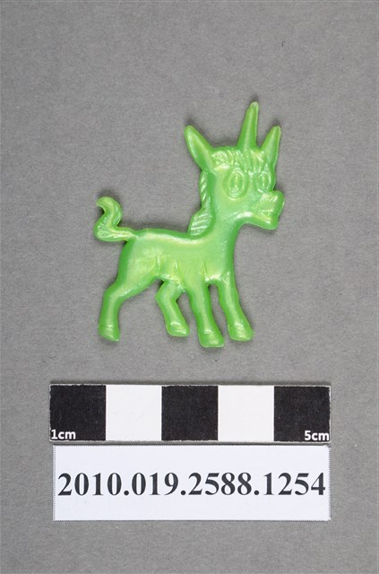 1.本物件為獨角獸尪仔仙。硬質塑膠材質,扁平,單一不透明綠色,雙面浮雕圖案,兩面圖案相同。圖案為站立的獨角獸,此為小獨角獸的身形,額頭上有角,耳朵立起,有鬃毛和尾巴。