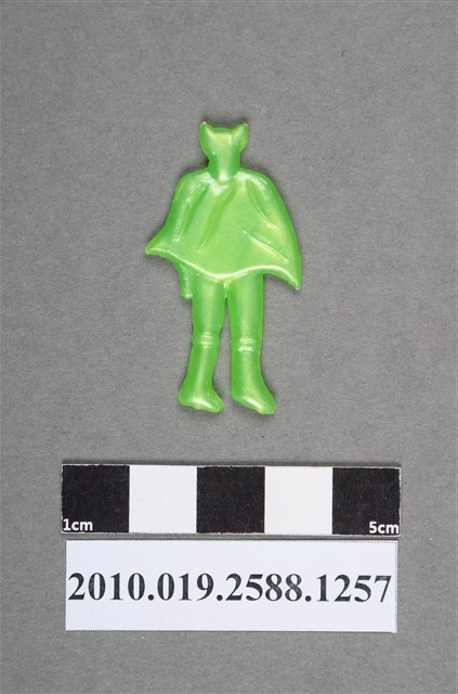 1.本物件為披風人型尪仔仙。硬質塑膠材質,扁平,單一不透明綠色,雙面浮雕圖案。正面圖案為男性站立人型,戴有頭盔,身上有披風,披風長度至臀部,穿有手套和靴子。其右手放在腹部,左手自然垂放。