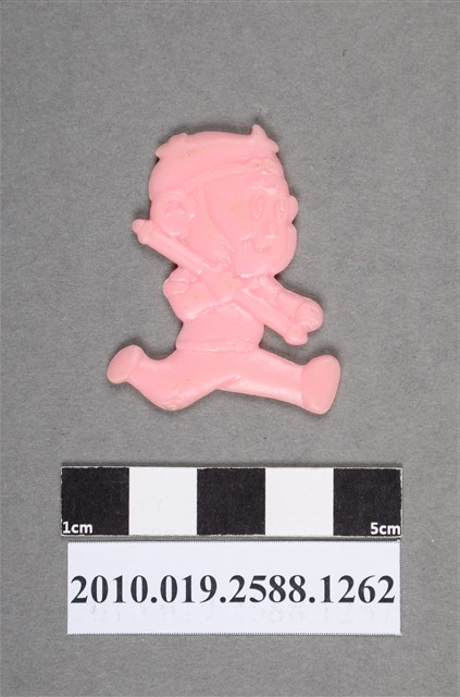 1.本物件為孫悟空尪仔仙。硬質塑膠材質,扁平,單一不透明粉紅色,雙面浮雕圖案,兩面圖案相同。圖案為Q版頭戴金箍的孫悟空,肩上扛著金箍棒,呈跑步姿勢。孫悟空為西遊記之角色。