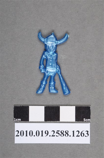 1.本物件為持棒人型尪仔仙。硬質塑膠材質,扁平,單一不透明藍色,雙面浮雕圖案。正面圖案為站立人型,頭戴維京海盜的雙角帽,腳穿靴子,右手拿著棒子,棒頭抵地。2.尪仔仙尺寸大致可分成小、中、大型,小型約長2-5公分,中型約長8-15公分,顏色以單色為主。有些大型的則可長達30公分左右,以菩薩、神仙和民間傳說故事人物等造型為主,塗上金銀紅黃彩漆等亮色。1960、70年代的尪仔仙多以民間傳說故事、歌仔戲、布袋戲人物為造型。1980年代改以卡通、電玩、漫畫人物造型為主。常見玩法之一為兩人(或多人)各持一只尪仔仙,輪流用手指彈射,看誰的尪仔仙先疊在對方上面,便可贏得對方用來對戰或是約定的尪仔仙。