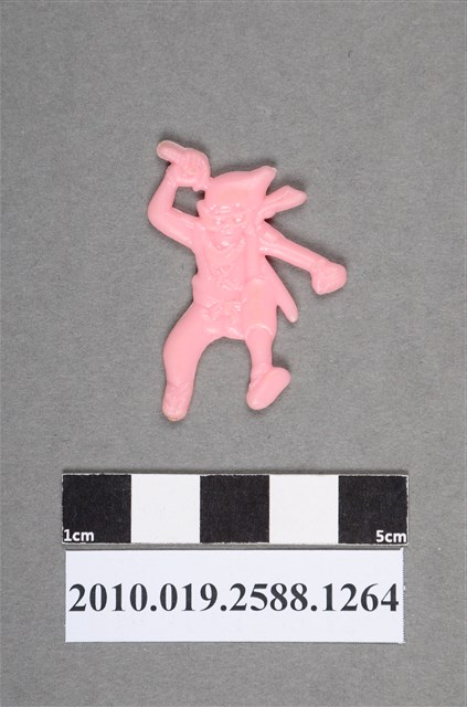 1.本物件為持劍人型尪仔仙。硬質塑膠材質,扁平,單一不透明粉紅色,雙面浮雕圖案,兩面圖案相同。圖案為跳躍起來的男性,其髮型偏向一側,戴有護目鏡,穿著夾腳拖鞋。其一手抓著長劍要由背後往前揮,另一手握拳,一腳往後蹬,另一腳膝蓋向前彎曲。2.尪仔仙尺寸大致可分成小、中、大型,小型約長2-5公分,中型約長8-15公分,顏色以單色為主。有些大型的則可長達30公分左右,以菩薩、神仙和民間傳說故事人物等造型為主,塗上金銀紅黃彩漆等亮色。1960、70年代的尪仔仙多以民間傳說故事、歌仔戲、布袋戲人物為造型。1980年代改以卡通、電玩、漫畫人物造型為主。常見玩法之一為兩人(或多人)各持一只尪仔仙,輪流用手指彈射,看誰的尪仔仙先疊在對方上面,便可贏得對方用來對戰或是約定的尪仔仙。