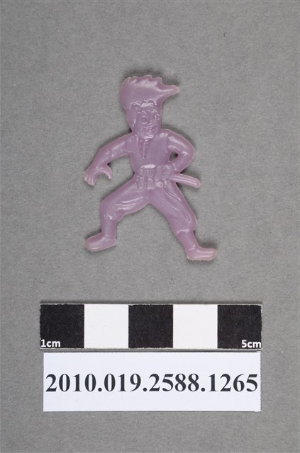 1.本物件為持劍人型尪仔仙。硬質塑膠材質,扁平,單一不透明紫色,雙面浮雕圖案,兩面圖案相同。圖案為站立男性,髮型斜向一邊,身穿背心式功夫服,腰間繫有腰帶,一手裡握住劍鞘,另一隻手張開,似要拉出劍。2.尪仔仙尺寸大致可分成小、中、大型,小型約長2-5公分,中型約長8-15公分,顏色以單色為主。有些大型的則可長達30公分左右,以菩薩、神仙和民間傳說故事人物等造型為主,塗上金銀紅黃彩漆等亮色。1960、70年代的尪仔仙多以民間傳說故事、歌仔戲、布袋戲人物為造型。1980年代改以卡通、電玩、漫畫人物造型為主。常見玩法之一為兩人(或多人)各持一只尪仔仙,輪流用手指彈射,看誰的尪仔仙先疊在對方上面,便可贏得對方用來對戰或是約定的尪仔仙。