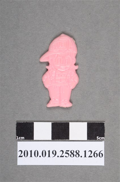 1.本物件為漫畫怪博士與機器娃娃之則卷阿拉蕾(丁小雨)尪仔仙。硬質塑膠材質,扁平,單一不透明粉紅色,雙面浮雕圖案,兩面圖案相同。圖案為小女孩人型,張嘴笑,戴著帽子和眼鏡,帽上有「ARALE」字樣,穿著吊帶褲,雙手插在口袋。