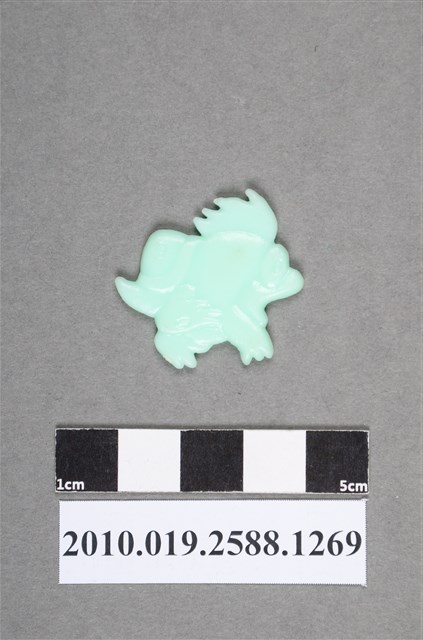 1.本物件為綠色雞型尪仔仙。硬質塑膠材質,扁平,單一不透明綠色,雙面浮雕圖案,兩面圖案相同。圖案為擬人化的動物組合體,頭頂有雞冠或片狀毛髮的部分,大眼,厚唇,嘴巴張開,背上有殼,短尾巴。2.尪仔仙尺寸大致可分成小、中、大型,小型約長2-5公分,中型約長8-15公分,顏色以單色為主。有些大型的則可長達30公分左右,以菩薩、神仙和民間傳說故事人物等造型為主,塗上金銀紅黃彩漆等亮色。1960、70年代的尪仔仙多以民間傳說故事、歌仔戲、布袋戲人物為造型。1980年代改以卡通、電玩、漫畫人物造型為主。常見玩法之一為兩人(或多人)各持一只尪仔仙,輪流用手指彈射,看誰的尪仔仙先疊在對方上面,便可贏得對方用來對戰或是約定的尪仔仙。