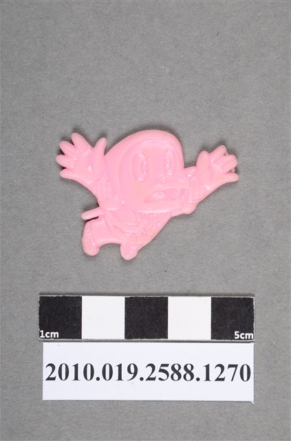 1.本物件為卡通忍者哈特利(忍者小叮噹)之哈特利尪仔仙。硬質塑膠材質,扁平,單一不透明粉紅色,雙面浮雕圖案,兩面圖案相同。圖案為哈特利從天而降的樣子,其嘴巴張開,頭上綁有頭巾,身穿忍者服,揹著刀,雙手張開,有驚恐的表情。