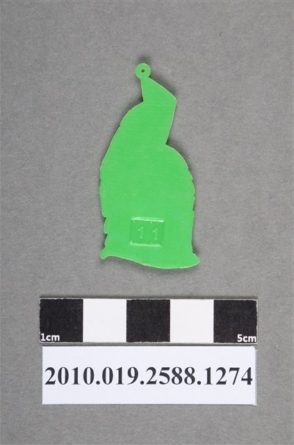 1.本物件為頭盔頭像尪仔仙。硬質塑膠材質,扁平,單一不透明綠色,單面浮雕圖案。正面圖案為戴著頭盔的頭像,頭頂有向上延伸的造型,頭盔外側有花紋,可見眼睛、鼻子和嘴巴,嘴巴嘴角下垂。頭頂造型上有小吊環,背面有11之陽刻字樣,是系列尪仔仙。2.尪仔仙尺寸大致可分成小、中、大型,小型約長2-5公分,中型約長8-15公分,顏色以單色為主。有些大型的則可長達30公分左右,以菩薩、神仙和民間傳說故事人物等造型為主,塗上金銀紅黃彩漆等亮色。1960、70年代的尪仔仙多以民間傳說故事、歌仔戲、布袋戲人物為造型。1980年代改以卡通、電玩、漫畫人物造型為主。常見玩法之一為兩人(或多人)各持一只尪仔仙,輪流用手指彈射,看誰的尪仔仙先疊在對方上面,便可贏得對方用來對戰或是約定的尪仔仙。