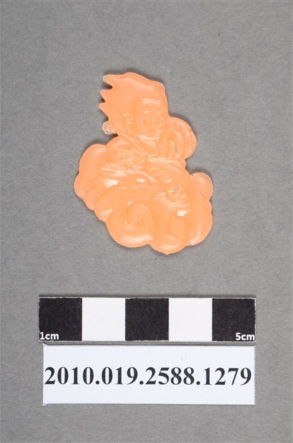 1.本物件為漫畫七龍珠之孫悟空尪仔仙。硬質塑膠材質,扁平,單一不透明橘色,雙面浮雕圖案,兩面圖案相同。圖案為站在筋斗雲上孫悟空,其髮型被風吹往後飛,一肩揹著包袱,手拉著帶子。