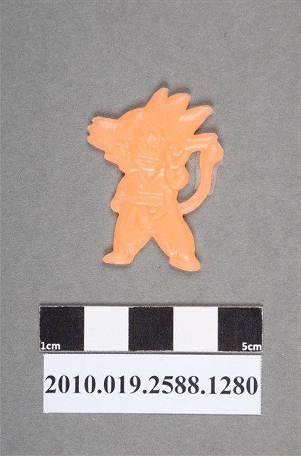 1.本物件為漫畫七龍珠之孫悟空尪仔仙。硬質塑膠材質,扁平,單一不透明橘色,雙面浮雕圖案,兩面圖案相同。從髮型和尾巴可以判斷出此圖案為小時候的孫悟空,其服裝為功夫服,腰間綁有腰帶,尾巴翹起來,一手朝前比YA,另一隻手自然垂下。
