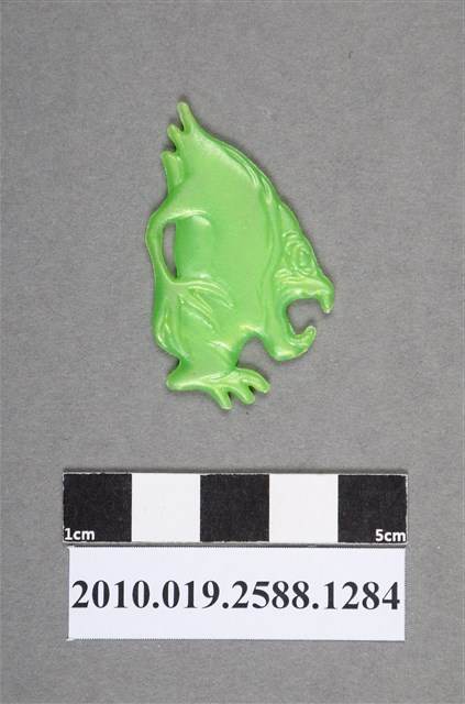 1.本物件為綠色怪物尪仔仙。硬質塑膠材質,扁平,單一不透明綠色,雙面浮雕圖案,兩面圖案相同。圖案為站立怪物的側面,嘴巴張開,頭部直接接腳部,手有4爪,腳有3趾。2.尪仔仙尺寸大致可分成小、中、大型,小型約長2-5公分,中型約長8-15公分,顏色以單色為主。有些大型的則可長達30公分左右,以菩薩、神仙和民間傳說故事人物等造型為主,塗上金銀紅黃彩漆等亮色。1960、70年代的尪仔仙多以民間傳說故事、歌仔戲、布袋戲人物為造型。1980年代改以卡通、電玩、漫畫人物造型為主。常見玩法之一為兩人(或多人)各持一只尪仔仙,輪流用手指彈射,看誰的尪仔仙先疊在對方上面,便可贏得對方用來對戰或是約定的尪仔仙。