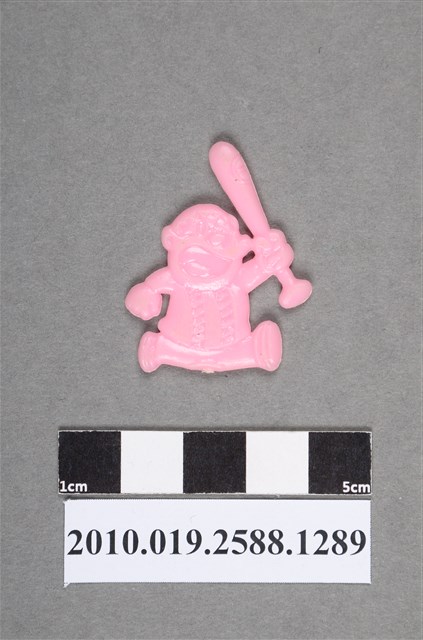 1.本物件為卡通哆啦A夢(小叮噹)之胖虎尪仔仙。硬質塑膠材質,扁平,單一不透明粉紅色,雙面浮雕圖案,兩面圖案相同。圖案為生氣的胖虎,臉部表情生氣,嘴巴張大,上衣有2條直條紋。其一手握著棒球棒,另一手握拳,雙腳幾乎呈直線狀,呈走路速度快之感。