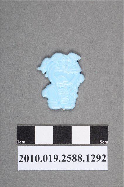 1.本物件為卡通哆啦A夢(小叮噹)之哆啦A夢尪仔仙。硬質塑膠材質,扁平,單一不透明藍色,雙面浮雕圖案,兩面圖案相同。圖案為打扮成日本武士的哆啦A夢,綁有頭帶,頭帶中間有圖案,額頭前有2片瀏海,後腦杓綁1撮頭髮,張嘴笑,腰間插有1把刀,其右手往上舉。