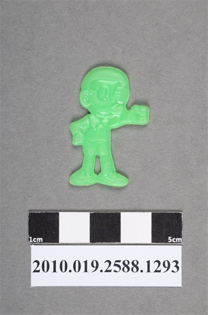 1.本物件為卡通哆啦A夢(小叮噹)之大雄(野比大雄)尪仔仙。硬質塑膠材質,扁平,單一不透明綠色,雙面浮雕圖案,兩面圖案相同。圖案為戴著眼鏡的大雄,一眼張開,一眼瞇著,嘴巴嘟起來,頸部綁有蝴蝶結,穿短褲。其為站立姿勢,一手伸出握拳,另一手放腰間。