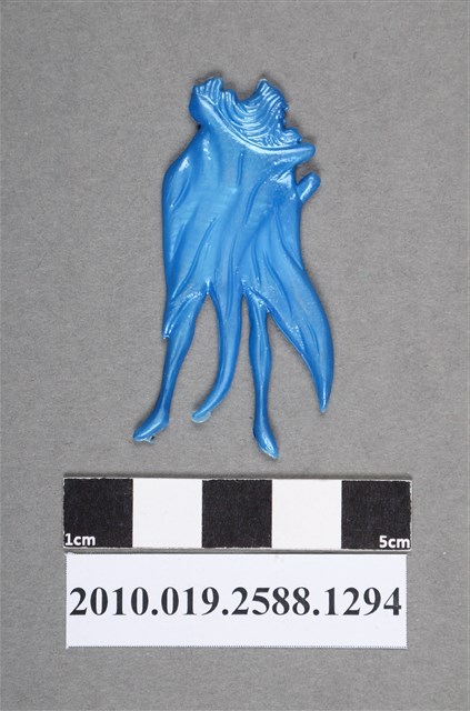 1.本物件為披風人型尪仔仙。硬質塑膠材質,扁平,單一不透明藍色,雙面浮雕圖案。正面圖案為站立人型,頭上戴有物品,身上披有披風,服裝在肩膀上有造型,繫有腰帶。其左手握拳舉起,右手垂下,雙腳著地2.尪仔仙尺寸大致可分成小、中、大型,小型約長2-5公分,中型約長8-15公分,顏色以單色為主。有些大型的則可長達30公分左右,以菩薩、神仙和民間傳說故事人物等造型為主,塗上金銀紅黃彩漆等亮色。1960、70年代的尪仔仙多以民間傳說故事、歌仔戲、布袋戲人物為造型。1980年代改以卡通、電玩、漫畫人物造型為主。常見玩法之一為兩人(或多人)各持一只尪仔仙,輪流用手指彈射,看誰的尪仔仙先疊在對方上面,便可贏得對方用來對戰或是約定的尪仔仙。