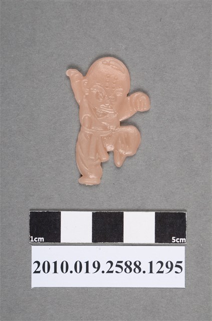 1.本物件為漫畫七龍珠之克林尪仔仙。硬質塑膠材質,扁平,單一不透明藕色,雙面浮雕圖案,兩面圖案相同。圖案為呈武功姿勢的克林,其頭上有6道戒疤,眉毛粗,腰間綁帶垂下,一手往後伸,一手往前伸,單腳站立,一腳膝蓋彎曲。
