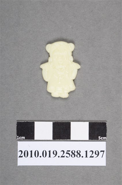 1.本物件為殭屍尪仔仙。硬質塑膠材質,扁平,單一不透明白色,雙面浮雕圖案,兩面圖案相同。圖案為Q版女性殭屍,因有橢圓形黑眼圈。其頭上綁有2個髮髻,有瀏海,嘴巴張開,其身穿裙子,裙子有摺,胸前戴有1串珠子,雙手平行舉起。2.尪仔仙尺寸大致可分成小、中、大型,小型約長2-5公分,中型約長8-15公分,顏色以單色為主。有些大型的則可長達30公分左右,以菩薩、神仙和民間傳說故事人物等造型為主,塗上金銀紅黃彩漆等亮色。1960、70年代的尪仔仙多以民間傳說故事、歌仔戲、布袋戲人物為造型。1980年代改以卡通、電玩、漫畫人物造型為主。常見玩法之一為兩人(或多人)各持一只尪仔仙,輪流用手指彈射,看誰的尪仔仙先疊在對方上面,便可贏得對方用來對戰或是約定的尪仔仙。