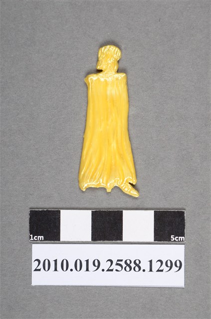 1.本物件為披風人型尪仔仙。硬質塑膠材質,扁平,單一不透明黃色,雙面浮雕圖案。正面圖案為站立人型,服裝造型有披風,長至腳踝,身材瘦,雙手垂下。2.尪仔仙尺寸大致可分成小、中、大型,小型約長2-5公分,中型約長8-15公分,顏色以單色為主。有些大型的則可長達30公分左右,以菩薩、神仙和民間傳說故事人物等造型為主,塗上金銀紅黃彩漆等亮色。1960、70年代的尪仔仙多以民間傳說故事、歌仔戲、布袋戲人物為造型。1980年代改以卡通、電玩、漫畫人物造型為主。常見玩法之一為兩人(或多人)各持一只尪仔仙,輪流用手指彈射,看誰的尪仔仙先疊在對方上面,便可贏得對方用來對戰或是約定的尪仔仙。