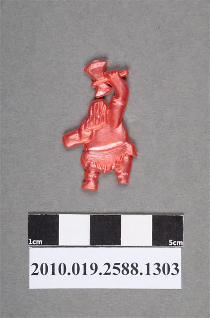 1.本物件為持斧人型尪仔仙。硬質塑膠材質,扁平,單一不透明紅色,雙面浮雕圖案。正面圖案為站立人型,嘴巴張開,表情呈憤怒貌,身形肥胖,左手握拳,右手高舉斧頭到頭頂上方。2.尪仔仙尺寸大致可分成小、中、大型,小型約長2-5公分,中型約長8-15公分,顏色以單色為主。有些大型的則可長達30公分左右,以菩薩、神仙和民間傳說故事人物等造型為主,塗上金銀紅黃彩漆等亮色。1960、70年代的尪仔仙多以民間傳說故事、歌仔戲、布袋戲人物為造型。1980年代改以卡通、電玩、漫畫人物造型為主。常見玩法之一為兩人(或多人)各持一只尪仔仙,輪流用手指彈射,看誰的尪仔仙先疊在對方上面,便可贏得對方用來對戰或是約定的尪仔仙。