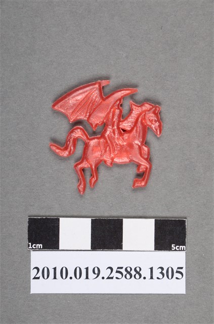 1.本物件為騎馬人型尪仔仙。硬質塑膠材質,扁平,單一不透明紅色,雙面浮雕圖案。正面圖案為1人背上有翅膀,翅膀展翅,坐在馬上,馬似奔跑貌。2.尪仔仙尺寸大致可分成小、中、大型,小型約長2-5公分,中型約長8-15公分,顏色以單色為主。有些大型的則可長達30公分左右,以菩薩、神仙和民間傳說故事人物等造型為主,塗上金銀紅黃彩漆等亮色。1960、70年代的尪仔仙多以民間傳說故事、歌仔戲、布袋戲人物為造型。1980年代改以卡通、電玩、漫畫人物造型為主。常見玩法之一為兩人(或多人)各持一只尪仔仙,輪流用手指彈射,看誰的尪仔仙先疊在對方上面,便可贏得對方用來對戰或是約定的尪仔仙。