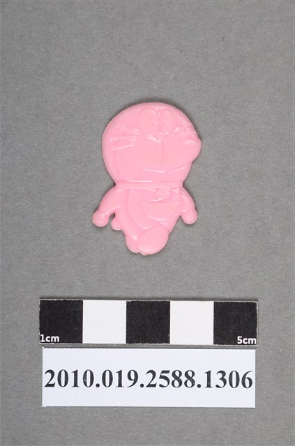 1.本物件為卡通哆啦A夢(小叮噹)之哆啦A夢尪仔仙。硬質塑膠材質,扁平,單一不透明粉紅色,雙面浮雕圖案,兩面圖案相同。圖案為正在走路的哆啦A夢,左右臉頰上各有3根鬚,臉上帶著微笑,眼睛呈彎月狀,雙手自然垂放。