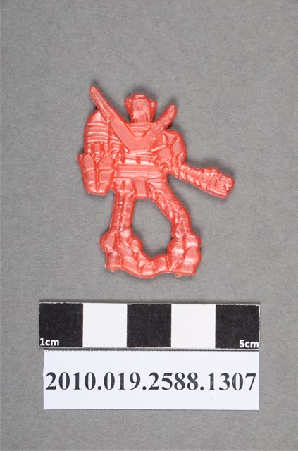 1.本物件為卡通聖戰士(百獸王)之聖戰士尪仔仙。硬質塑膠材質,扁平,單一不透明紅色,雙面浮雕圖案。正面圖案為站立機器人型,其背後有V字裝飾,其手與腳部可見獅頭造型。