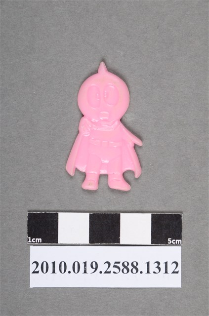 1.本物件為披風人型尪仔仙。硬質塑膠材質,扁平,單一不透明粉紅色,雙面浮雕圖案,兩面圖案相同。圖案為戴著面具型頭盔遮住全頭部,頭盔正中間有尖角,服裝有披風和腰帶之站立人型。其眼睛呈橢圓形,一手往前指,一手垂放。2.尪仔仙尺寸大致可分成小、中、大型,小型約長2-5公分,中型約長8-15公分,顏色以單色為主。有些大型的則可長達30公分左右,以菩薩、神仙和民間傳說故事人物等造型為主,塗上金銀紅黃彩漆等亮色。1960、70年代的尪仔仙多以民間傳說故事、歌仔戲、布袋戲人物為造型。1980年代改以卡通、電玩、漫畫人物造型為主。常見玩法之一為兩人(或多人)各持一只尪仔仙,輪流用手指彈射,看誰的尪仔仙先疊在對方上面,便可贏得對方用來對戰或是約定的尪仔仙。