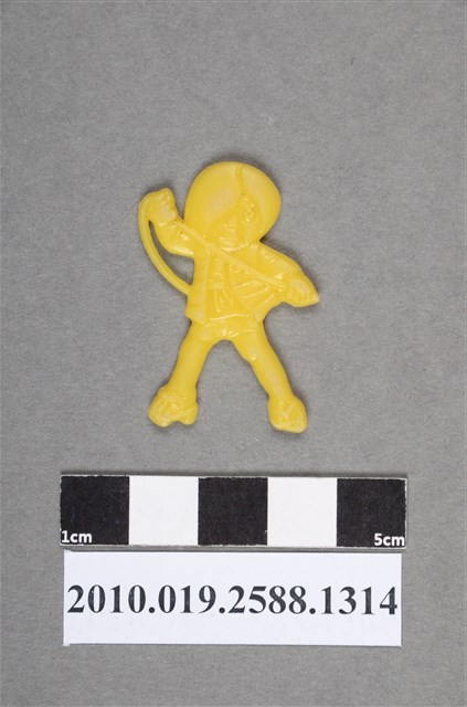 1.本物件為漫畫鬼太郎之鬼太郎尪仔仙。硬質塑膠材質,扁平,單一不透明黃色,雙面浮雕圖案,兩面圖案相同。圖案為站立的鬼太郎,一邊頭髮蓋住眼睛,只露出1隻眼睛,穿著橫紋背心、短褲和日式木屐,雙手握住鞭子。