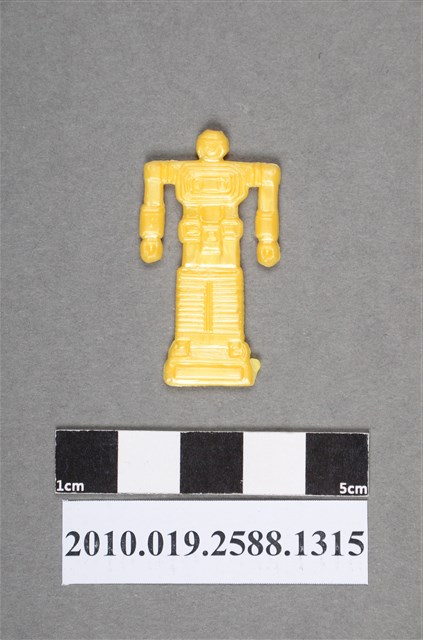 1.本物件為黃色機器人型尪仔仙。硬質塑膠材質,扁平,單一不透明黃色,雙面浮雕圖案。正面圖案為站立機器人,頭小身大,臉部不見五官。肩膀明顯,胸前有方形圖案,內部有雙圓,雙手呈拳狀,雙腳有橫條紋並且併攏。2.尪仔仙尺寸大致可分成小、中、大型,小型約長2-5公分,中型約長8-15公分,顏色以單色為主。有些大型的則可長達30公分左右,以菩薩、神仙和民間傳說故事人物等造型為主,塗上金銀紅黃彩漆等亮色。1960、70年代的尪仔仙多以民間傳說故事、歌仔戲、布袋戲人物為造型。1980年代改以卡通、電玩、漫畫人物造型為主。常見玩法之一為兩人(或多人)各持一只尪仔仙,輪流用手指彈射,看誰的尪仔仙先疊在對方上面,便可贏得對方用來對戰或是約定的尪仔仙。