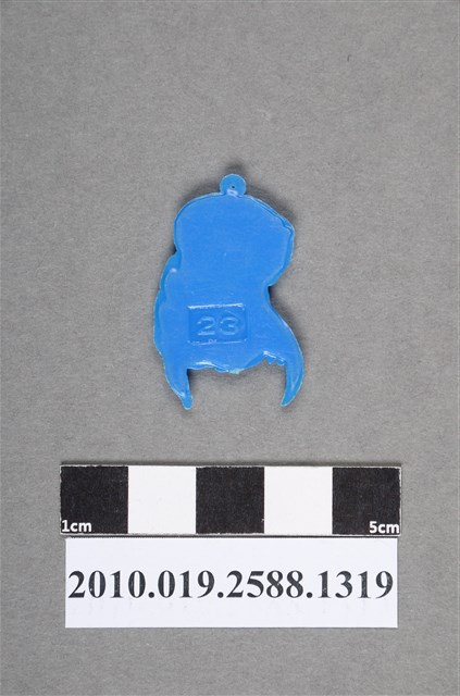1.本物件為怪物頭像尪仔仙。硬質塑膠材質,扁平,單一不透明藍色,單面浮雕圖案。正面圖案為怪物頭像,有橢圓形眼睛,類似鼻孔的地方有觸鬚,觸鬚下方有似大顎的部位。頭頂造型上有小吊環,背面有23之陽刻字樣,是系列尪仔仙。2.尪仔仙尺寸大致可分成小、中、大型,小型約長2-5公分,中型約長8-15公分,顏色以單色為主。有些大型的則可長達30公分左右,以菩薩、神仙和民間傳說故事人物等造型為主,塗上金銀紅黃彩漆等亮色。1960、70年代的尪仔仙多以民間傳說故事、歌仔戲、布袋戲人物為造型。1980年代改以卡通、電玩、漫畫人物造型為主。常見玩法之一為兩人(或多人)各持一只尪仔仙,輪流用手指彈射,看誰的尪仔仙先疊在對方上面,便可贏得對方用來對戰或是約定的尪仔仙。