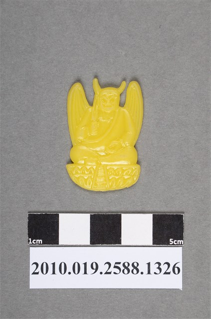 1.本物件為黃色怪物尪仔仙。硬質塑膠材質,扁平,單一不透明黃色,雙面浮雕圖案,兩面圖案相同。圖案為盤腿坐在蓮花座上的怪物,其頭上長有2個角,臉部表情邪惡,背上有翅膀,一手舉著雙叉型物品,一手放在腿上。2.尪仔仙尺寸大致可分成小、中、大型,小型約長2-5公分,中型約長8-15公分,顏色以單色為主。有些大型的則可長達30公分左右,以菩薩、神仙和民間傳說故事人物等造型為主,塗上金銀紅黃彩漆等亮色。1960、70年代的尪仔仙多以民間傳說故事、歌仔戲、布袋戲人物為造型。1980年代改以卡通、電玩、漫畫人物造型為主。常見玩法之一為兩人(或多人)各持一只尪仔仙,輪流用手指彈射,看誰的尪仔仙先疊在對方上面,便可贏得對方用來對戰或是約定的尪仔仙。