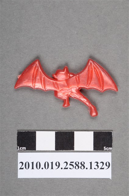 1.本物件為飛天怪物尪仔仙。硬質塑膠材質,扁平,單一不透明紅色,雙面浮雕圖案。正面圖案為飛天怪物,頭部兩旁有尖形大耳,長相似大金剛,有雙手,雙腳如人足,背上有翅膀,翅膀往外張開,可見骨架。2.尪仔仙尺寸大致可分成小、中、大型,小型約長2-5公分,中型約長8-15公分,顏色以單色為主。有些大型的則可長達30公分左右,以菩薩、神仙和民間傳說故事人物等造型為主,塗上金銀紅黃彩漆等亮色。1960、70年代的尪仔仙多以民間傳說故事、歌仔戲、布袋戲人物為造型。1980年代改以卡通、電玩、漫畫人物造型為主。常見玩法之一為兩人(或多人)各持一只尪仔仙,輪流用手指彈射,看誰的尪仔仙先疊在對方上面,便可贏得對方用來對戰或是約定的尪仔仙。
