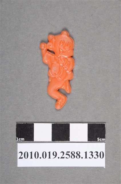 1.本物件為橘色人型尪仔仙。硬質塑膠材質,扁平,單一不透明橘色,雙面浮雕圖案,兩面圖案相同。圖案為頭上綁著2個髮髻的人型,張嘴笑,面容愉快,一手拉著1包物品,另一手高舉,一腳離地抬起,另一腳尖著地。2.尪仔仙尺寸大致可分成小、中、大型,小型約長2-5公分,中型約長8-15公分,顏色以單色為主。有些大型的則可長達30公分左右,以菩薩、神仙和民間傳說故事人物等造型為主,塗上金銀紅黃彩漆等亮色。1960、70年代的尪仔仙多以民間傳說故事、歌仔戲、布袋戲人物為造型。1980年代改以卡通、電玩、漫畫人物造型為主。常見玩法之一為兩人(或多人)各持一只尪仔仙,輪流用手指彈射,看誰的尪仔仙先疊在對方上面,便可贏得對方用來對戰或是約定的尪仔仙。