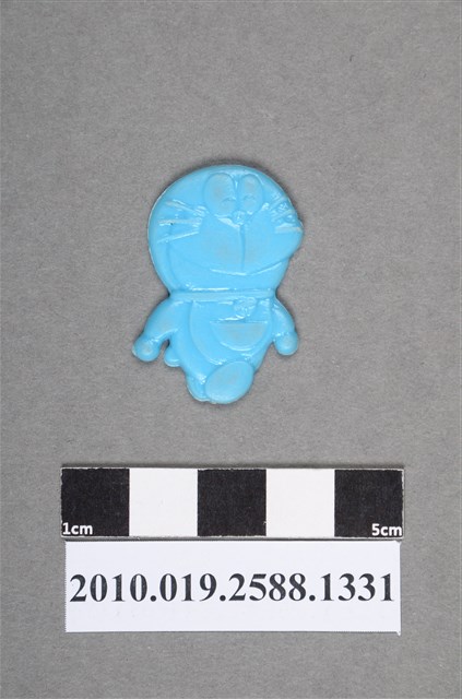 1.本物件為卡通哆啦A夢(小叮噹)之哆啦A夢尪仔仙。硬質塑膠材質,扁平,單一不透明藍色,雙面浮雕圖案,兩面圖案相同。圖案為正在走路的哆啦A夢,左右臉頰上各有3根鬚,臉上帶著微笑,眼睛呈彎月狀,雙手自然垂放。