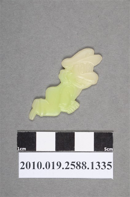1.本物件為電玩超級瑪利歐兄弟(超級瑪利)之瑪利歐尪仔仙。硬質塑膠材質,扁平,顏色有漸層效果,從綠色到黃色,大部分為綠色,雙面浮雕圖案,兩面圖案相同。圖案為瑪利歐戴著帽子,穿著吊帶褲,雙手似撐著平面,雙腳抬起,屁股翹起,有要往上前進之貌。