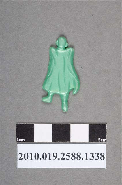 1.本物件為漫畫七龍珠之比克尪仔仙。硬質塑膠材質,扁平,單一不透明綠色,雙面浮雕圖案,兩面圖案相同。圖案為站立的比克,披有披風,穿著功夫服,左手垂下,右手握拳舉起。