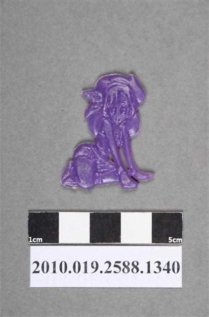 1.本物件為漫畫七龍珠之蘭琪尪仔仙。硬質塑膠材質,扁平,單一不透明紫色,雙面浮雕圖案,兩面圖案相同。圖案為跪在地上的蘭琪,長髮,頭上綁有絲帶,繫有蝴蝶結,穿著短褲,雙手撐在地上。