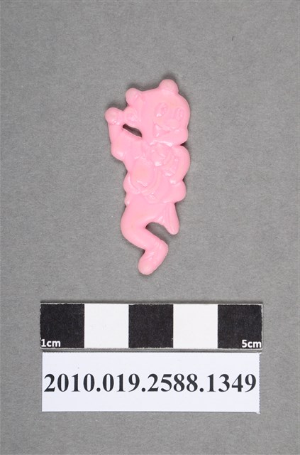 1.本物件為粉紅色人型尪仔仙。硬質塑膠材質,扁平,單一不透明粉紅色,雙面浮雕圖案,兩面圖案相同。圖案為頭上綁著2個髮髻的人型,張嘴笑,面容愉快,一手拉著1包物品,另一手高舉,一腳離地抬起,另一腳尖著地。2.尪仔仙尺寸大致可分成小、中、大型,小型約長2-5公分,中型約長8-15公分,顏色以單色為主。有些大型的則可長達30公分左右,以菩薩、神仙和民間傳說故事人物等造型為主,塗上金銀紅黃彩漆等亮色。1960、70年代的尪仔仙多以民間傳說故事、歌仔戲、布袋戲人物為造型。1980年代改以卡通、電玩、漫畫人物造型為主。常見玩法之一為兩人(或多人)各持一只尪仔仙,輪流用手指彈射,看誰的尪仔仙先疊在對方上面,便可贏得對方用來對戰或是約定的尪仔仙。