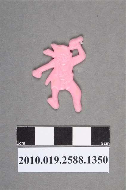 1.本物件為持劍人型尪仔仙。硬質塑膠材質,扁平,單一不透明粉紅色,雙面浮雕圖案,兩面圖案相同。圖案為跳躍起來的男性,其髮型偏向一側,戴有護目鏡,穿著夾腳拖鞋。其一手抓著長劍要由背後往前揮,另一手握拳,一腳往後蹬,另一腳膝蓋向前彎曲。2.尪仔仙尺寸大致可分成小、中、大型,小型約長2-5公分,中型約長8-15公分,顏色以單色為主。有些大型的則可長達30公分左右,以菩薩、神仙和民間傳說故事人物等造型為主,塗上金銀紅黃彩漆等亮色。1960、70年代的尪仔仙多以民間傳說故事、歌仔戲、布袋戲人物為造型。1980年代改以卡通、電玩、漫畫人物造型為主。常見玩法之一為兩人(或多人)各持一只尪仔仙,輪流用手指彈射,看誰的尪仔仙先疊在對方上面,便可贏得對方用來對戰或是約定的尪仔仙。
