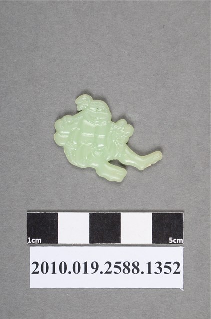 1.本物件為卡通忍者龜之忍者龜尪仔仙。硬質塑膠材質,扁平,單一不透明綠色,雙面浮雕圖案,兩面圖案相同。圖案為坐在地上的忍者龜,其頭上有綁帶。在卡通設定中,忍者龜有4位,但無法判斷此尪仔仙是哪一位。