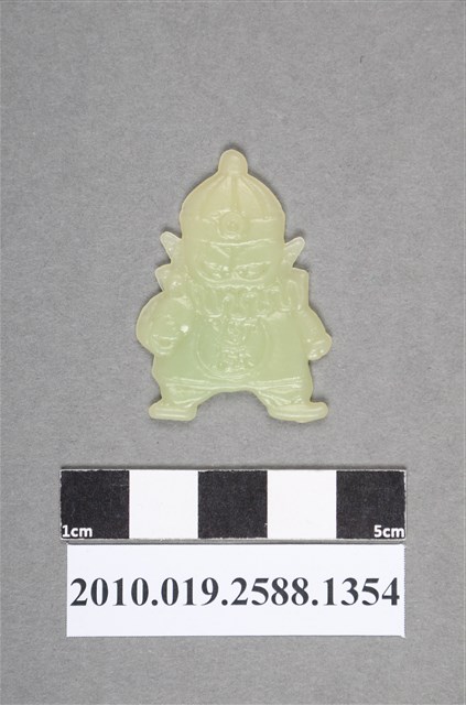 1.本物件為漫畫七龍珠之皮拉夫(炒飯大王)尪仔仙。硬質塑膠材質,扁平,單一不透明綠色,雙面浮雕圖案,兩面圖案相同。圖案是皮拉夫頭戴瓜皮帽,有對尖耳,服裝在脖子上有一圈造型,衣服有「炒飯」字樣,一手拿著龍珠,一手自然垂下。在漫畫設定中,皮拉夫是反派角色。