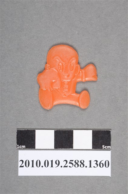1.本物件為拳擊人型尪仔仙。硬質塑膠材質,扁平,單一不透明橘色,雙面浮雕圖案,兩面圖案相同。圖案為光頭男生,眉毛明顯,呈坐姿,雙手握拳,有一拳往前擊。2.尪仔仙尺寸大致可分成小、中、大型,小型約長2-5公分,中型約長8-15公分,顏色以單色為主。有些大型的則可長達30公分左右,以菩薩、神仙和民間傳說故事人物等造型為主,塗上金銀紅黃彩漆等亮色。1960、70年代的尪仔仙多以民間傳說故事、歌仔戲、布袋戲人物為造型。1980年代改以卡通、電玩、漫畫人物造型為主。常見玩法之一為兩人(或多人)各持一只尪仔仙,輪流用手指彈射,看誰的尪仔仙先疊在對方上面,便可贏得對方用來對戰或是約定的尪仔仙。