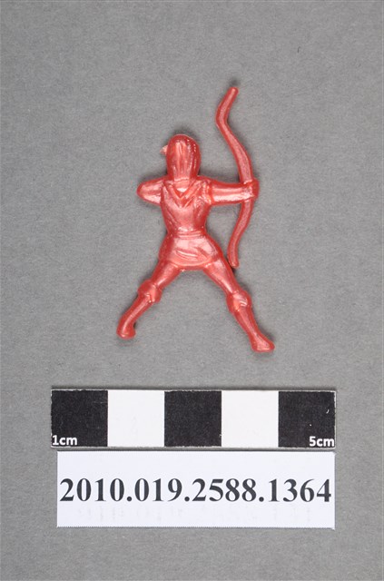 1.本物件為持弓人型尪仔仙。硬質塑膠材質,扁平,單一不透明紅色,雙面浮雕圖案。正面圖案為站立人型,一手拿著弓箭,一手彎曲,作出拉弓姿勢,背後有V字型領口裝飾,雙腳跨開。2.尪仔仙尺寸大致可分成小、中、大型,小型約長2-5公分,中型約長8-15公分,顏色以單色為主。有些大型的則可長達30公分左右,以菩薩、神仙和民間傳說故事人物等造型為主,塗上金銀紅黃彩漆等亮色。1960、70年代的尪仔仙多以民間傳說故事、歌仔戲、布袋戲人物為造型。1980年代改以卡通、電玩、漫畫人物造型為主。常見玩法之一為兩人(或多人)各持一只尪仔仙,輪流用手指彈射,看誰的尪仔仙先疊在對方上面,便可贏得對方用來對戰或是約定的尪仔仙。